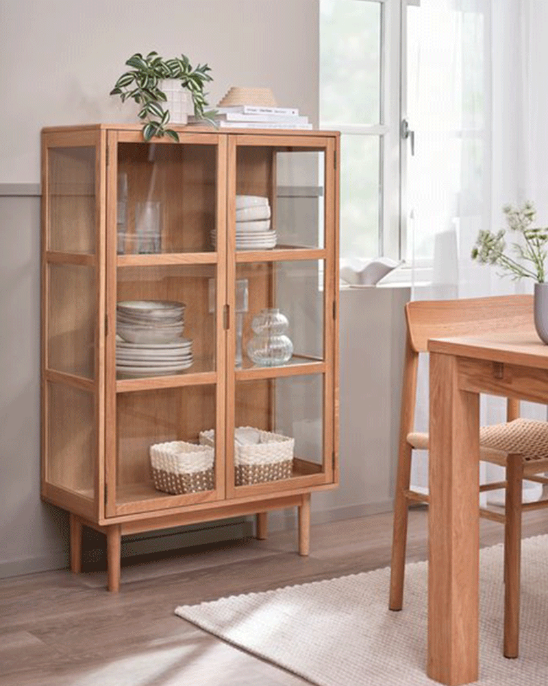 Cam dolaplar, cam temizleme ürünleriyle ve yumuşak bir bezle kolayca temizlenebilir.